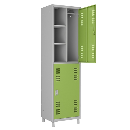 Medidas: 1820a x 520l x 420p,chapa 24, roupeiro com pitao p/ cadeado, malha perfurada p/ melhor ventilacao, portas 470 x 860mm embutidas que possibilitam fechamento preciso com seguranca, altura do pe nivelador 80mm.