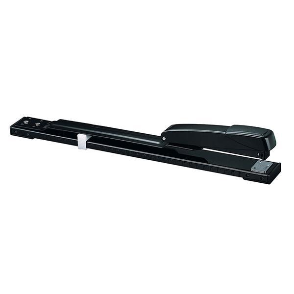 Grampeador de longo alcance, utiliza grampo 26/6 e 24/6, capacidade: pente inteiro, base calibrada e ajustavel, todo de metal preto